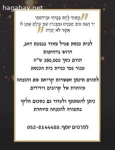 לבית הכנסת "קול - אליה" בגבעת זאב, דרוש בדחיפות תורם בסך 350.000₪ עבור גמר בניית בית הכנסת. לתורם תינתן אפשרות קריאת שם והנצחה מיוחדת של קרובים וידידים.
